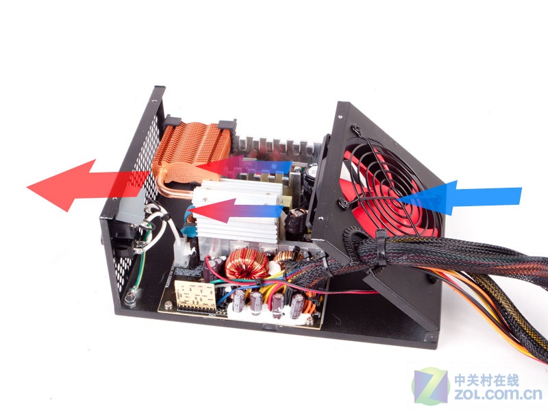 超频三A30电源外观与一般电源一样,同样采用全黑化处理,主要是为了防止电源外壳在看空气中的老化。并且也是跟随目前主流电源设计的风格。电源采用斜吹散热设计,因此电源风扇被设计安放在外壳的斜面上。另外为了保证电源散热需要的风量,以及电源的静音效果,电源采用一款10cm散热风扇,为电源散热。另外斜吹式设计,还解决了传统电源风扇转速不能过快的问题,因为电源风扇过快的转速会导致风向反弹,不但不能达到良好的散热效果,而且还会严重影响风扇的使用寿命。电源后部出风口的电源插头处,带有一个独立的电源开关,可以在关闭电脑后,关闭开关实现待机零功耗。这款电源的额定功率为400W,采用双路12V输出,两路通过电流分别为17A和14A,12V最大输出功率最大为550W。电源采用主动PFC设计,工作电压可在100至240V电压之间工作。另外电源通过了80Plus白牌认证,但是转换效率最高却超过了85%,同时,待机功耗小于1W。电源除了配有一个20+4Pin主电源线和4+4Pin CPU供电线之外,还配有2个6+2Pin、5个SATA接口、4个D型口,足以满足普通平台的需求,并且在主要电源线均带有蛇皮包线设计。
